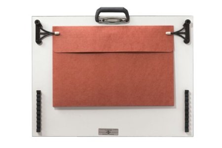 A smooth, warp-free white Melamine(R) laminated board with black edges. The non-slip tractor feet firmly hold the drawing board at a comfortable angle. Contoured handle for comfortable carrying.