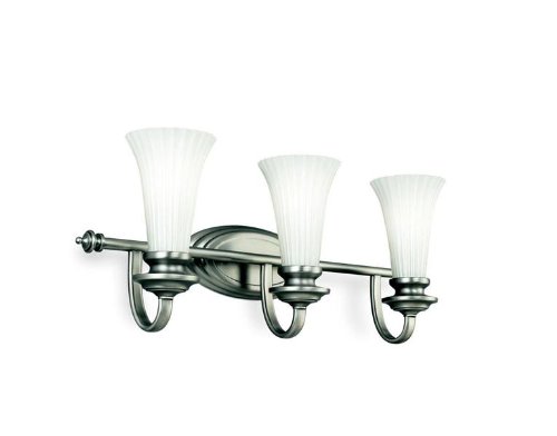 Transitional Bath Vanity Light in Brushed Pewter with White Cased Opal glass from the Abbeyville Collection by Kichler. Dimensions: 10 H 25.5 W 7.5 E